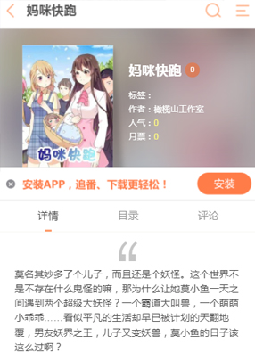 简介: 漫画《妈咪快跑》讲诉了为什么突然自己莫名其妙的多了一个儿子,还有一个老公?主要还是他们还都是妖怪?!老天,那我怎么办嘛?
