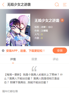 无脸少女之逆袭 2025-07-26 07:56 2025-07-26 07:56 开始阅读 微信阅读 简介:漫画《无脸少女之逆袭》讲述了面具人还能谈恋爱嘛?因为长相不好看,所以时常带着面具,但是在其他人的眼中!面具人是怪物还是变态一直不受到其他人的喜爱,那么她是不是能够重新像正常人一样好好的谈恋爱呢?只要摘下面具之后,是不是就可以呢?尽情期待吧!看看无脸少女谈恋爱! 标签: 韩国漫画
