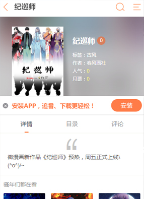 开始阅读 微信阅读 简介:漫画《纪训师》简述:你可见过,红色的萤火虫?你可想过《山海经》是因何诞生?你真的以为,“黑暗森林”只是遥远光年以外的世界吗?不,他一直就在我们的身边,有时安静,有时凶险,他们一起集结成一群鲜有人知的纪训师!跟随他们的脚步,看清之前的世界!